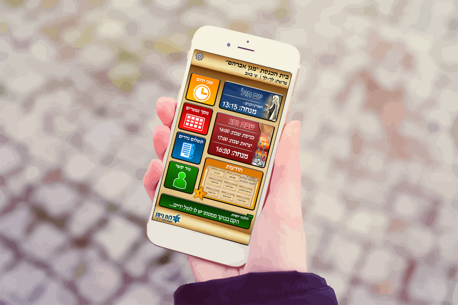 חידוש נוסף שפיתחנו ל- לוח ניסן – שילוט דיגיטלי ממוחשב לבית הכנסת הוא אפליקציה לכל מתפלל, כל מתפלל בבית הכנסת יכול להוריד את האפליקציה ולקבל עידכונים מבית הכנסת שלו, על זמני התפילות, שיעורים, הודעות מיוחדות ועוד.